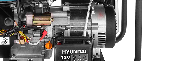 Генератор Hyundai HHY 5020FE оснащен фирменным четырехтактным двигателем Hyundai IC340, предназначенным для интенсивных нагрузок. Запустить мотор можно повернув ключ зажигания, как в автомобиле. Электростартер питается от встроенного аккумулятора, который заряжается в процессе работы. Также сохранена возможность ручного запуска тросом.