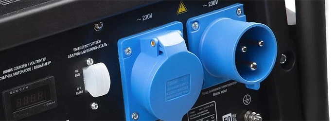 Потребителей можно подключать к бытовой розетке на 16 А и силовому разъему на 32 А. Благодаря подпружиненной пластиковой крышке в розетки не попадают пыль и влага.