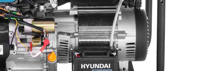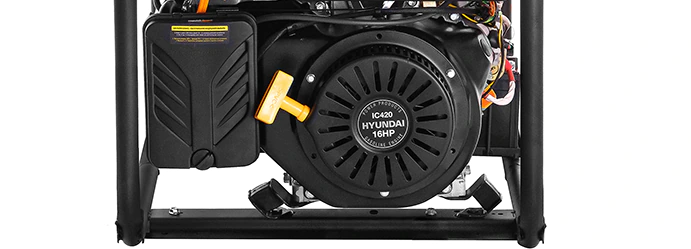 На генератор установлен фирменный двигатель Hyundai серии IC (Industrial Commercial) с верхним расположением клапанов. Мощность мотора 16 л.с. обеспечивает 6,5 кВт на выходе, чего достаточно для обеспечения электричеством дачи, загородного дома или строительной площадки.