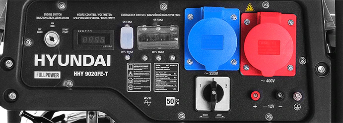 Бензиновый генератор Hyundai HHY 9020FE-T оснащен переключателем между однофазным и трехфазным режимами работы. Красная силовая розетка предназначена для подключения мощного оборудования, которому необходимо напряжение 380 В. На цифровом дисплее выводятся значения напряжения, тока, частоты и количества моточасов.