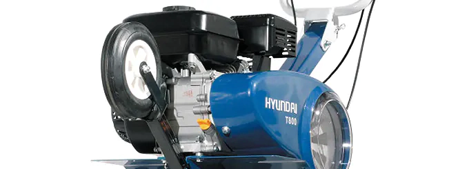 Hyundai T 800 оснащен 4-тактным двигателем мощностью 6,5 л.с. Самоходный бензокультиватор имеет две передачи: переднюю и заднюю. Задний ход делает технику более маневренной, помогает быстро извлекать застрявшие фрезы.