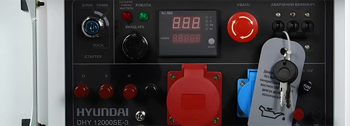 Двигатель генератора Hyundai DHY 12000SE-3 легко запускается поворотом ключа в замке зажигания. Для подключения потребителей предусмотрены две розетки на 230 В/16 А и 400 В/32 А, разъем постоянного тока на 12 В. Панель управления закрыта дверцей, запирающейся на ключ, во избежание несанкционированного доступа. Закрытый корпус защищает от попадания пыли и влаги на внутренние элементы, а также эффективно поглощает шум.