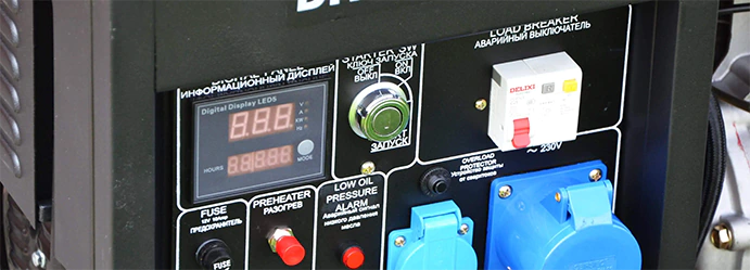 Панель управления оснащена двумя розетками 220 В, к которым подключается однофазное оборудование. Суммарная мощность потребителей не должна превышать 5 кВт. Есть также выход постоянного тока на 12 В, который предназначен для зарядки автомобильного аккумулятора. Hyundai DHY 6000LE снабжен регулятором напряжения AVR. Он гарантирует стабильное питание подключенных потребителей.