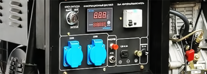 На экране отображаются напряжение, мощность, частота тока, количество отработанных моточасов, что позволяет постоянно контролировать показатели.