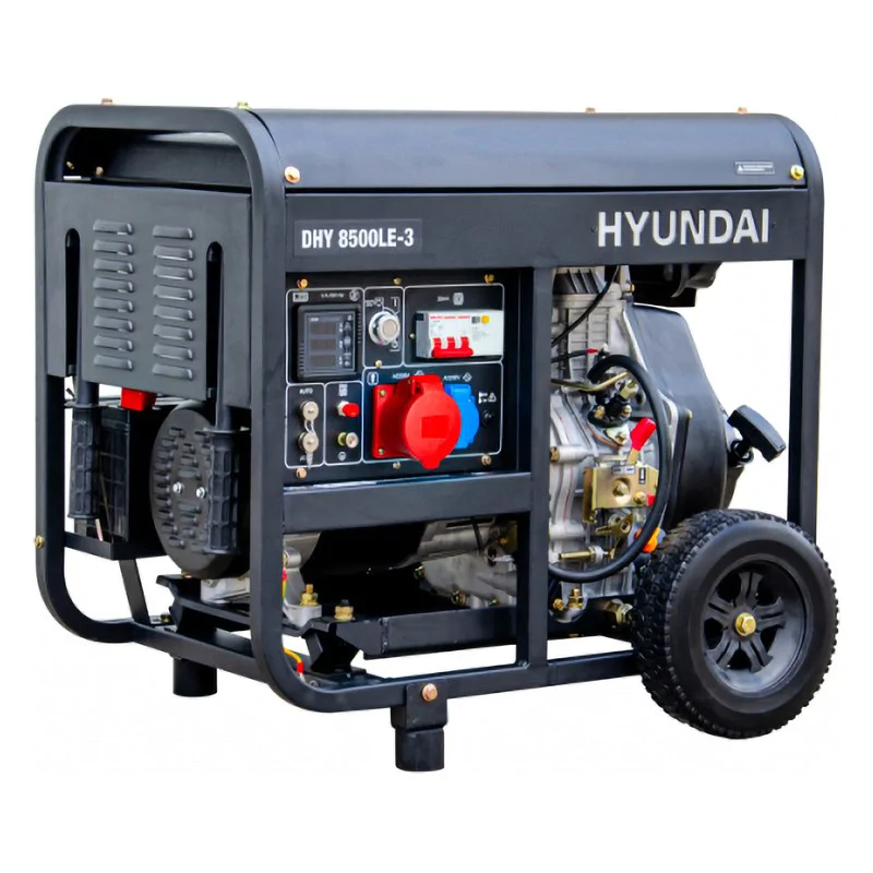 Hyundai DHY 8500LE-3 оснащен фирменным двигателем D500E объемом 498 см³ и мощностью 13 л.с. Благодаря инжекторной системе прямого впрыска топливная смесь подается напрямую в камеру сгорания, что существенно сокращает потребление топлива и уменьшает количество выхлопов. Завести мотор можно как вручную, так и с помощью электростартера.