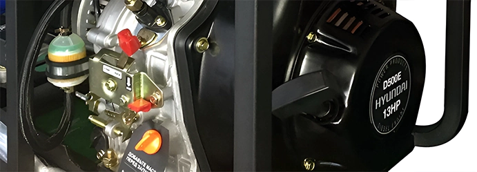 В генераторе установлен 4-тактный дизельный двигатель Hyundai D500E. Он выдает максимальную мощность в 13 л.с., позволяя подключать к передвижной электростанции мощную технику. За счет экономного потребления топлива полной заправки хватит до 7,5 ч непрерывного использования дизельного генератора при нагрузке 75%.