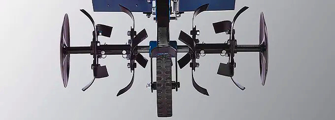 Защитные диски по бокам фрез позволяют рыхлить землю рядом с деревьями, заборами, бордюрами, не повреждая их.