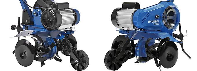 Hyundai T 2000E подключается к бытовой электросети 220 В. Запуск двигателя осуществляется нажатием на кнопку предохранителя и рычаг газа, расположенный на правой рукоятке. Левая рукоять оснащена рычагом, активирующим привод на фрезы.