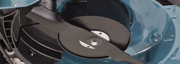 Для скашивания травы используется прочный стальной нож, который одинаково хорошо справляется как со свежей молодой зеленью, так и с жесткими сорняками. По бокам лезвие слегка изогнуто, наподобие лопастей. Это позволяет создать восходящий воздушный поток, который приподнимает травинки для более аккуратного среза, а также позволяет более плотно набивать травосборник.