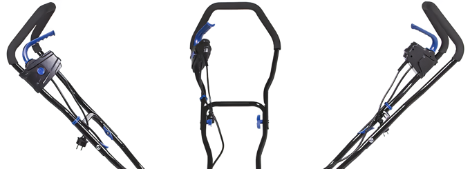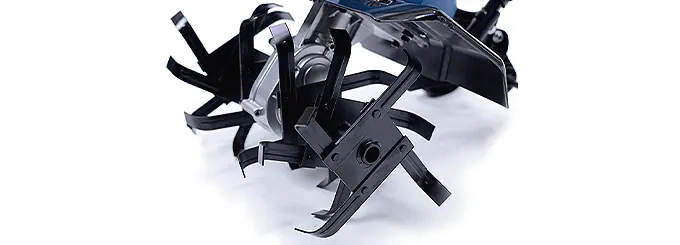 Держатель культиватора имеет мягкую нескользящую накладку для удобного и надежного хвата. Для электрического кабеля предусмотрен фиксатор, который предотвращает отключение техники от сети и уменьшает риск попадания провода под фрезы.